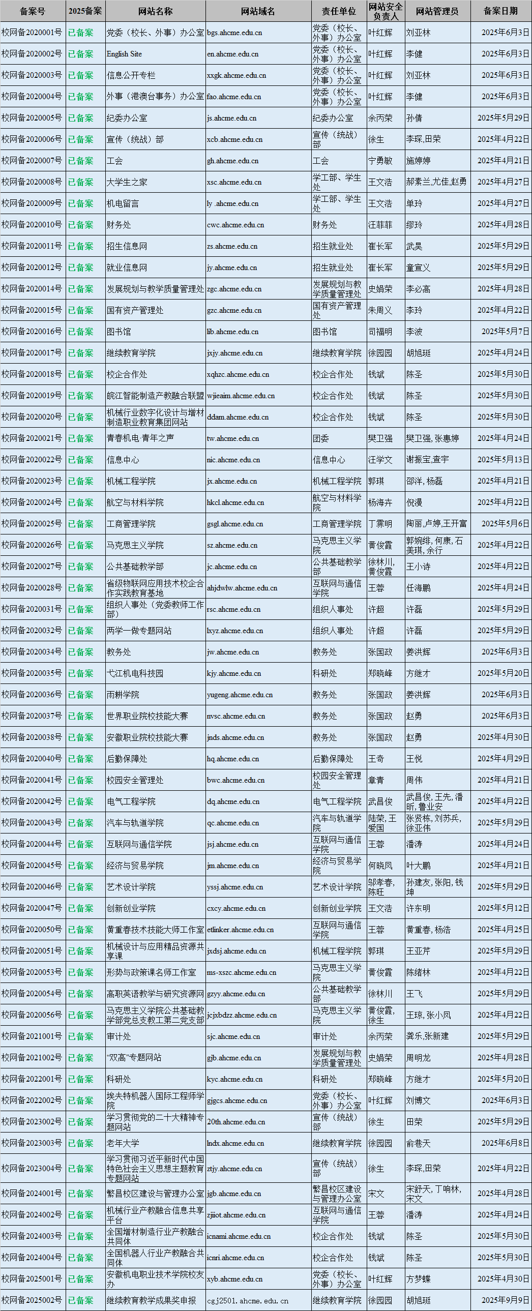 根据《安徽机电职业技术学院网站群管理办法》,截至2025年6月9日,共有32个校属单位提交了59个网站的备案申请。根据《安徽机电职业技术学院网站群管理办法》要求,学校网络安全与信息化领导小组办公室对备案材料进行了核验,通过了59个二级网站的审查备案。现将名单公示如下。