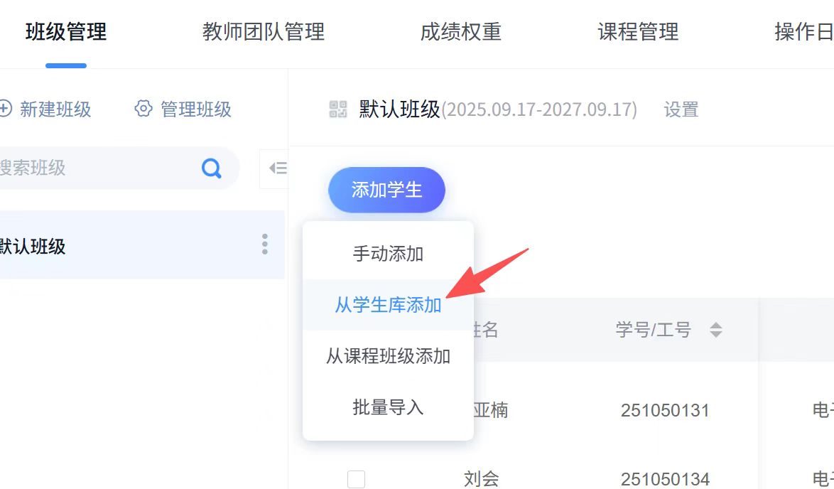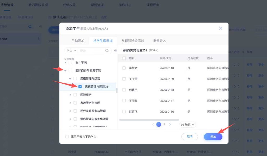 4、添加学生进入班级,可以在班级管理模块通过学生库添加,找到对应的院系、专业、班级组织架构后,勾选对应班级批量添加。