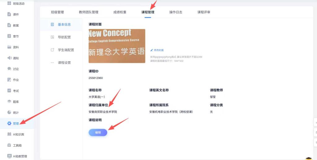 3、建设好课程之后,进入课程管理界面,将课程所属单位设置为安徽商贸职业技术学院(单位代码 17209)